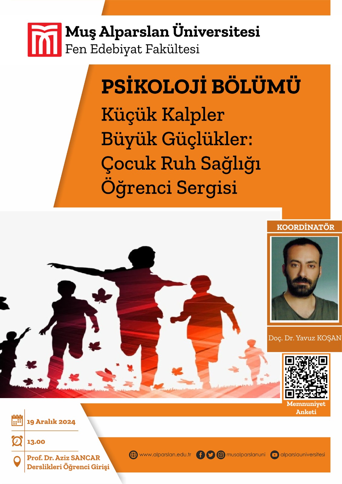 Psikoloji Bölümü Öğretim Üyelerinden Doç. Dr. Yavuz KOŞAN 19 Aralık 2024 Tarihinde Saat 13 : 00 da Aziz SANCAR Derslikleri Öğrenci Girişinde "Küçük Kalpler Büyük Güçlükler : Çocuk Ruh Sağlığı Öğrenci Sergisi" başlıklı bir etkinlik yapacaktır.