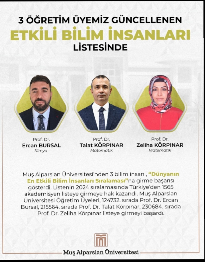 Muş Alparslan University's Faculty of Arts and Sciences continues to make a name for itself nationally and internationally with its scientific achievements. The faculty's academic staff contributes to the prestige not only of our university but also of the Turkish scientific community. Most recently, Prof. Dr. Talat Körpınar, Dean of the Faculty of Arts and Sciences and Vice Rector, earned a place on the "World's Most Influential Scientists" list, one of the world's most prestigious academic rankings. Prof. Dr. Körpınar, who has drawn attention with his high-quality scientific work and high-impact publications in mathematics, has been a source of great pride for both our faculty and our university.