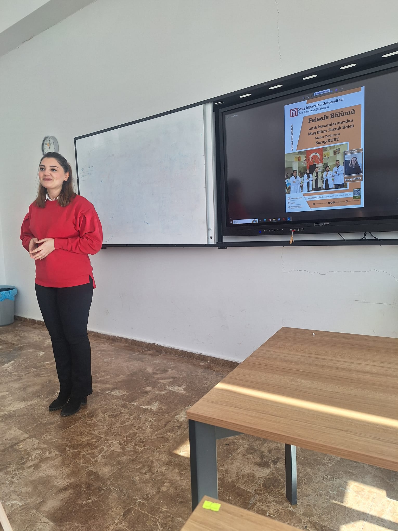 Felsefe Bölümü Mezun Buluşması Etkinliğinde 2016 Yılı mezunlarımızdan Muş Bilim Teknik Koleji Müdür Yardımcısı Serap KURT 27 Kasım 2024 Saat 13 00 da bir sunum gerçekleştirdi. Sunumda mezun öğrencimiz mezuniyet sonrası deneyimlerini Aktardı. Sunum daha sonra öğrenci ve hocaların soru ve cevaplarıyla devam etti. Sunumun sonunda Felsefe Bölüm Başkanı Doç. Dr. Ümit KARTAL konuşmacıya plaket takdim etti.