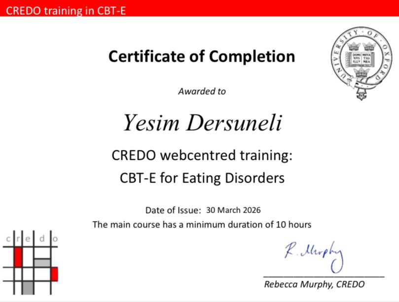 Fakültemiz Psikoloji Bölümü Araştırma Görevlisi Yeşim Dersuneli, Oxford Üniversitesi Yeme Bozuklukları Araştırma Merkezi (CREDO) tarafından online olarak düzenlenen Geliştirilmiş Bilişsel Davranışçı Terapi (CBT-E) eğitimini başarıyla tamamladı.